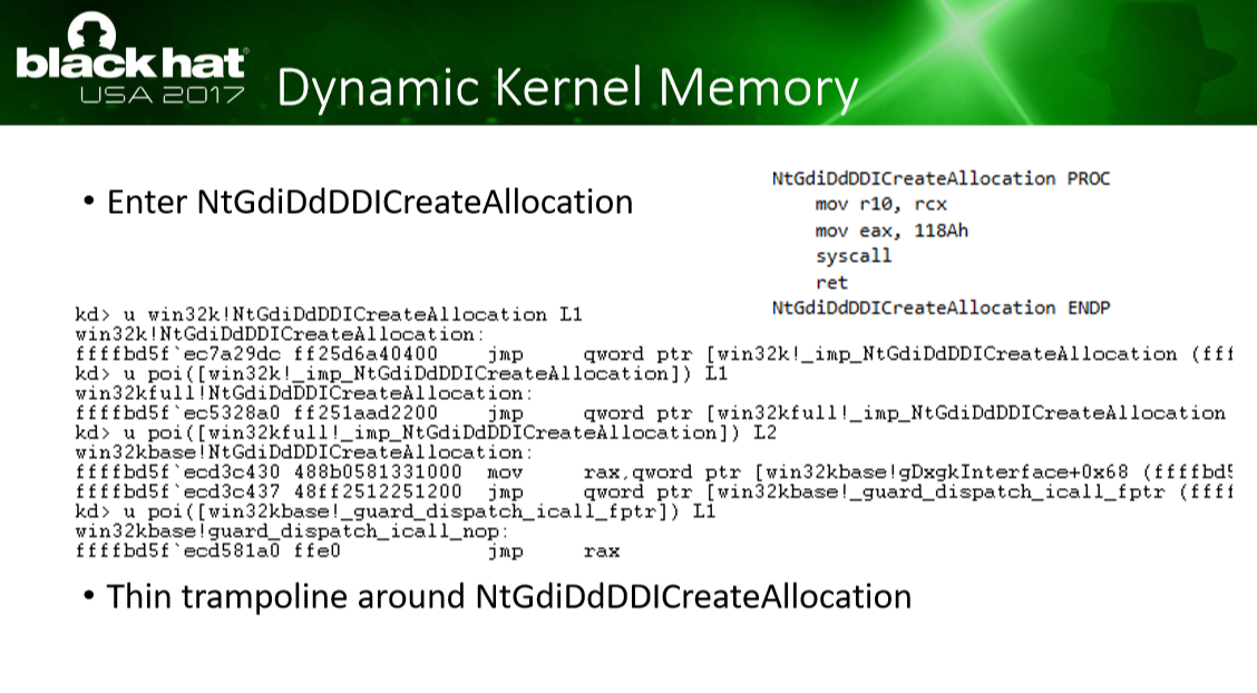 NtGdiDdDDICreateAllocation,或者大佬博客里提到的NtGdiDdDDIGetContextSchedulingPriority这类和GDI相关的API调用的处理驱动中,有一些函数会从win32kbase!gDxgkInterface这个全局对象表中取出自己实际调用的函数地址。而这个API是可以接受至少两个参数的,这就让我们替换ExpAllocatePool成为了可能。这里的分析文章中也提到了,这种攻击是确实可行的。