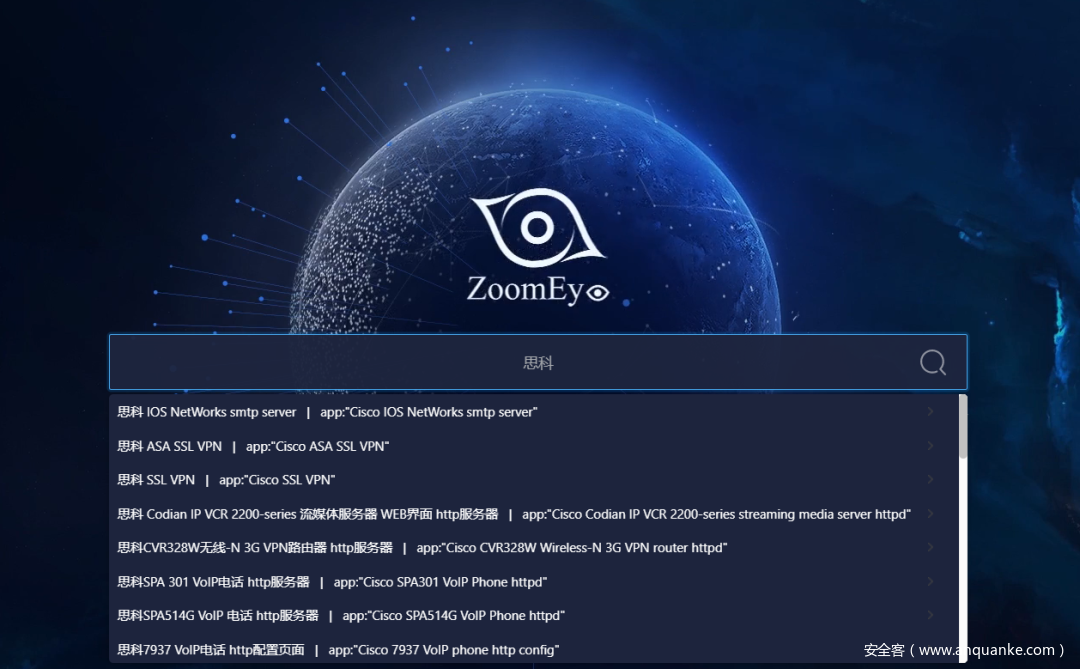 为了方便用户更快、更准确的查询到对应的硬件/软件产品,ZoomEye 增加了 Dork 功能。用户只需要在搜索界面输入相应的关键词,例如厂商名称思科、具体的型号DIR-850,都可以快速匹配到已知的 ZoomEye Dork。