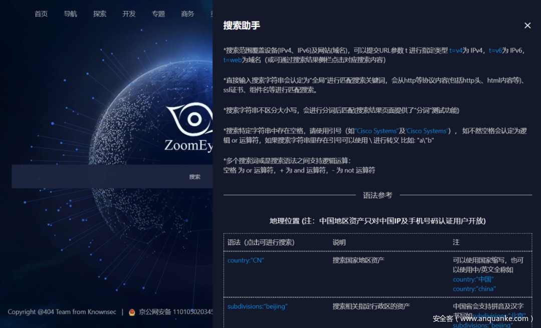 使用“搜索助手”功能替换了老版里的“高级搜索”功能,让初学者了解学习ZoomEye搜索语法变得更加容易。