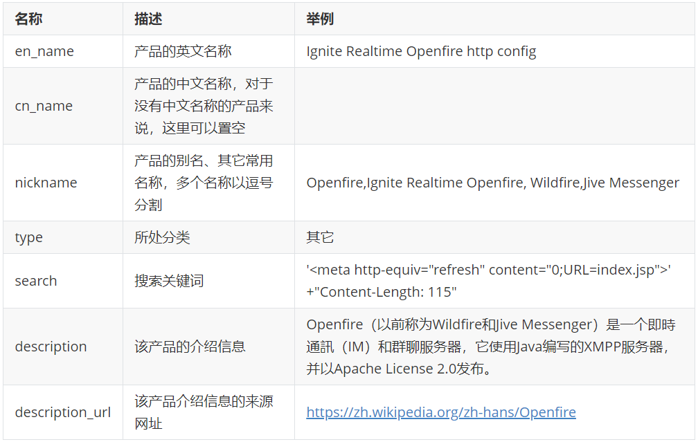 对于 Ignite Realtime Openfire http config 而言,通常会称呼为 Openfire 或者 Ignite Realtime Openfire。在wiki百科中,我们还可以知道,它以前被称为 Wildfire 和 Jive Messenger。所以该字段可以填写的内容是 Openfire,Ignite Realtime Openfire, Wildfire,Jive Messenger。