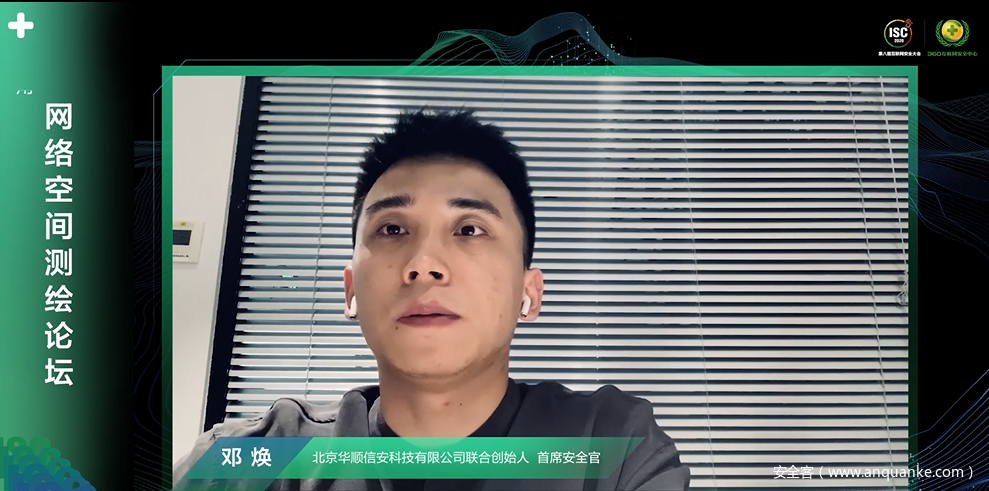 作为威胁分析、安全研究方面的专家,华顺信安联合创始人 首席安全官的邓焕就网络空间测绘技术现状进行了分析,并从攻击者视角分享了来自黑灰产业的真实攻击事件及华顺信安在网络空间测绘技术方面的思考和实践。