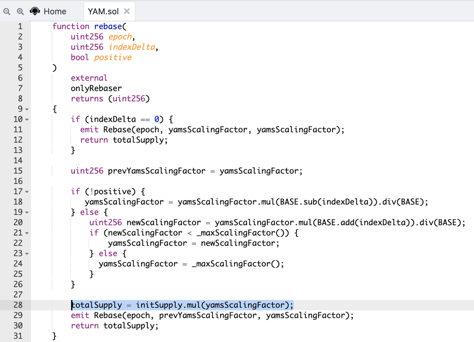 该漏洞发生在YAM项目智能合约YAM.sol的rebase功能上,如下图所示: