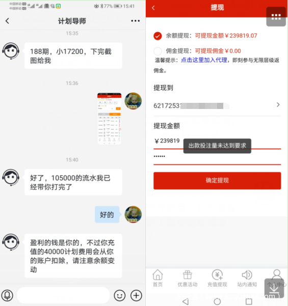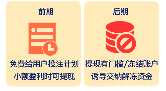 n无法提现。前期投注小金额可盈利并能成功提现,后期用户加大投注力度后,提现时会遇到各种阻碍,比如:设置提现金额门槛、或通过冻结用户博彩平台账号。此时,所谓的“客服”会以各种理由让你转账,可多次支付后依然无法提现,目的就是骗取用户交纳解冻资金。