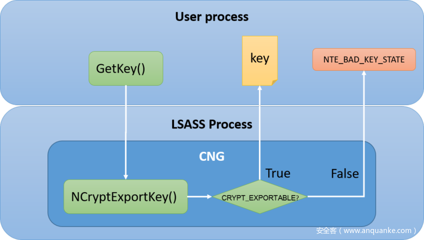 提取受CNG保护的私钥将需要管理员特权以修改LSASS进程(与上述原理相同,覆盖JMP指令绕过密钥导出时的安全检查),流程如下: