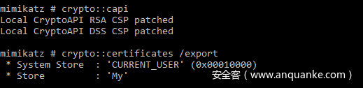 让我们先尝试导出证书而不修改CryptoAPI相关函数,在mimikatz控制台输入如下命令尝试导出证书: