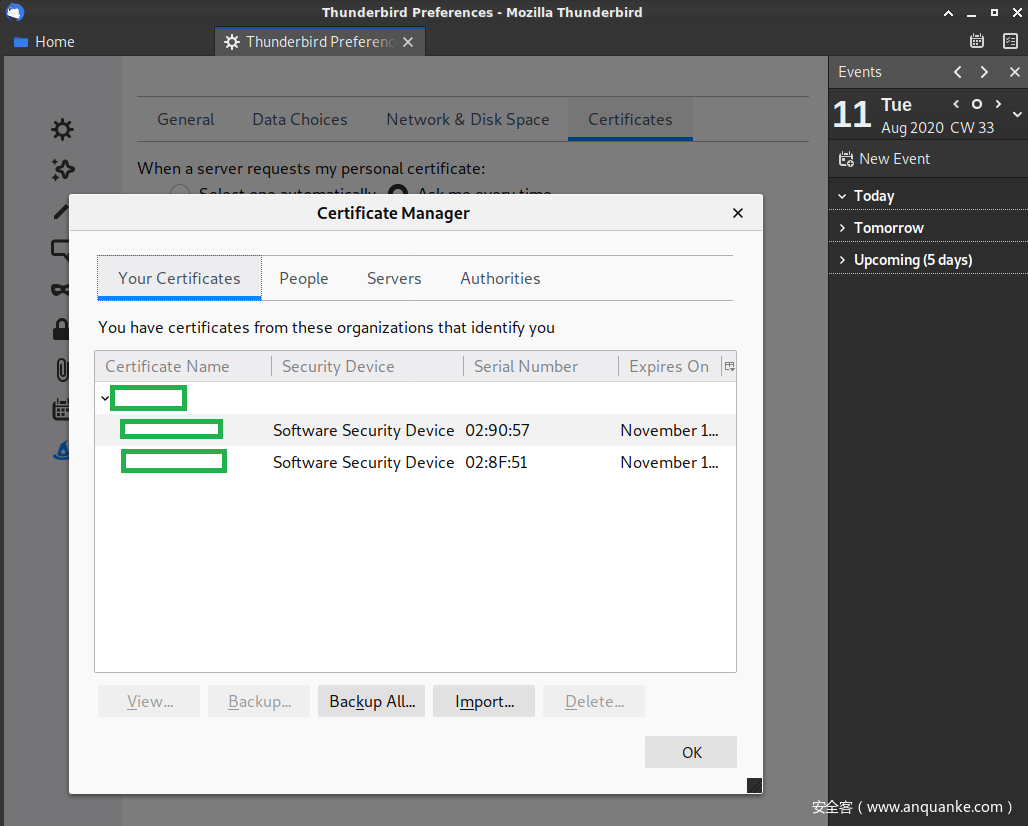 另外也可以通过Thunderbird(是Mozilla公司发布的一款开源邮件客户端)来轻松完成,我需要在Thunderbird中导入了.pfx密钥(配置菜单 » 证书 » 证书管理 » 你的证书 » 导入),如下: