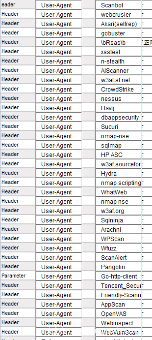 红方在踩点过程中,必然要用扫描器,连接高危端口的扫描器方式在上面的防火墙策略已经拦截,那么就开始用web应用扫描器,常见的扫描器user-agent如下,策略都是永久封堵。