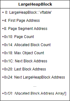 在创建大量数组后,Internet Explorer会分配新的LargeHeapBlock对象,这些对象会被IE的自定义堆实现使用。LargeHeapBlock对象将存储缓冲区地址,讲这些地址分配给数组。如果成功实现了预期的内存布局,则该漏洞将使用0覆盖LargeHeapBlock偏移量0x14处的值,该值恰好是分配的块数。jscript9.dll x86的LargeHeapBlock结构: