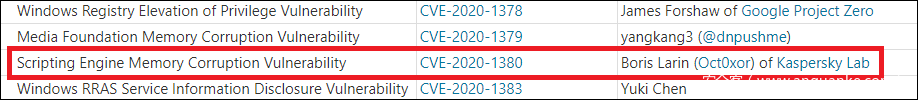 Microsoft为JScript的Use-After-Free漏洞分配了CVE-2020-1380编号,该漏洞的补丁于2020年8月11日发布。