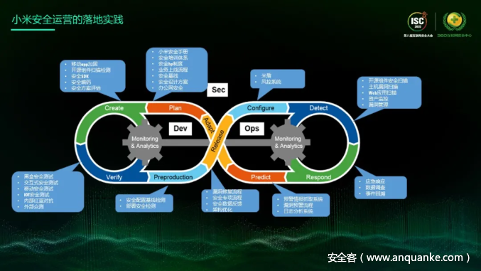 右边devsecops体系可以看做是小米内部的安全运营工作的指导,安全运营需要将sec融合到dev和ops阶段,完成整体业务的安全闭环,融合到业务的各个阶段,与dev人员、ops人员不断沟通,构造小米自己的devsecops体系。