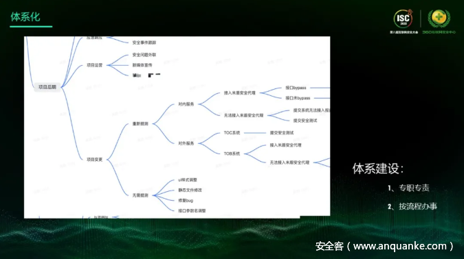 首先是体系化。针对业务应该做什么,在项目的前期、中期、后台我应该怎么做这些问题,我们有一个流程指导。上图只是流程大概的脑图展示,过程中需要专职专人负责,每一块都有专门的安全人员进行对接,并且按照流程进行。流程化的东西使得每一步都有记录跟进、处理,每个人也容易把自己的工作做到闭环。