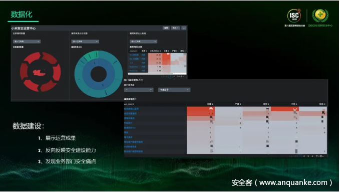 最后是数据化平台建设,通过对运营过程中产生的数据进行图表化的展示,一方面能很好的展示出安全建设的运营效果,反向反映出安全建设的能力;另一方面可以通过对漏洞数据的汇总分析出业务部门的短板在哪,可以针对业务部门的短板进行弥补升级和优化等。