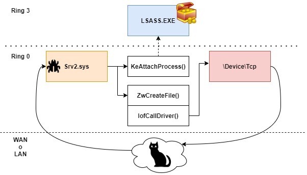 Payload与用户模式不会进行任何交互,并使用传输驱动程序接口(TDI)创建反向TCP套接字,该接口是更现代的Winsock内核(WSK)的前身。LSASS.exe进程内存和模块随后通过网络发送,这些信息将转换为minidump文件发送到攻击者一侧,并通过使用Mimikatz等工具提取用户凭据。
