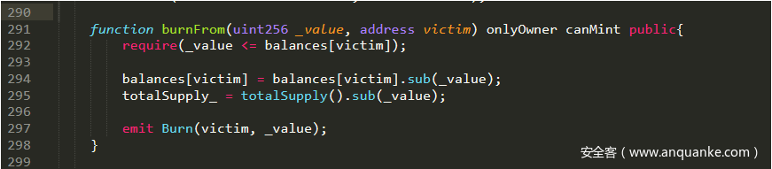 漏洞分析:如上图所示合约中的burnFrom函数用于销毁代币,但是该函数只能被合约的owner调用,而且由于地址参数可控故合约的owner可以操控任意地址用户的代币,销毁任意地址用户任意数量的代币(数量小于等于用户代币总量),由于该函数被canMint修饰,所以查看一下该修饰器