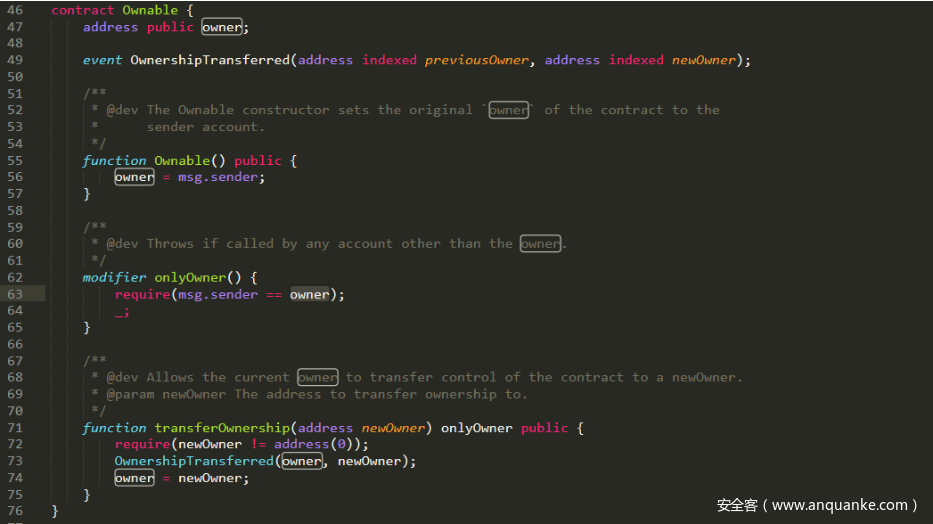 之后查看onlyOwner修饰器可以看到此处需要msg.sender为owner,即合约的owner,在构造函数中进行初始化: