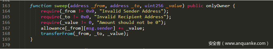 在transfer函数中判断转账地址是否为空、进行转账防溢出检查、进行转账操作,通过以上逻辑可以发现由于sweep中的地址参数 _ from、_to可控,而且该函数只能被合约的owner调用,所以合约的owner可以通过该函数操控任意用户的balance,并且将其转向任意用户的地址或者自己的地址。
