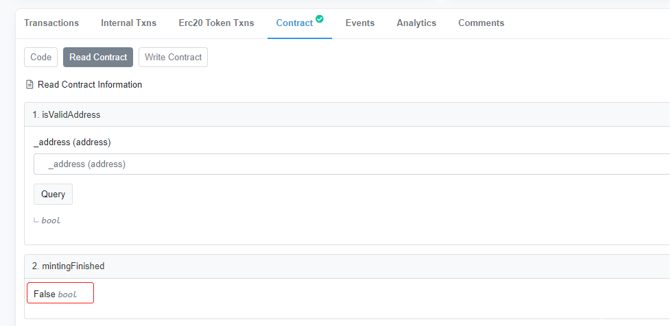 之后通过”Read Contract”来查看当前”mintingFinished”的值: