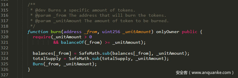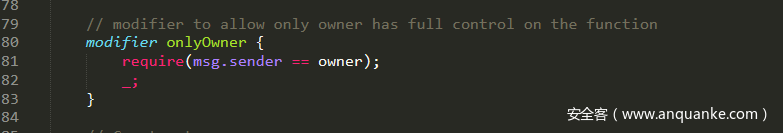 漏洞分析:如上图所示在智能合约中提供了burn函数,该函数主要用于销毁其它地址的token,当要销毁的token数量小于目标账户所拥有的token值时就可以成功销毁目标账户的token,且这里的地址可以指定为任意用户的地址,所以只要我们能够调用该函数即可通过赋予 from为任意地址账户, unitAmout为任意数量(不超过from账户拥有的数量)就可以销毁_from账户的代币,下面我们再来看一下此处对于函数调用者身份限定的修饰器—onlyOwner