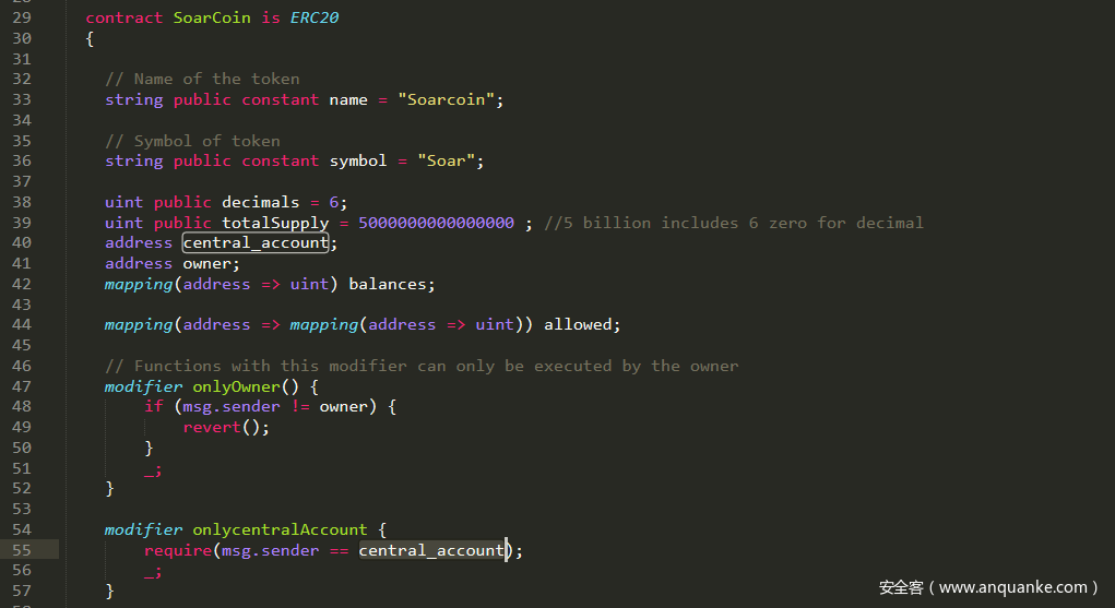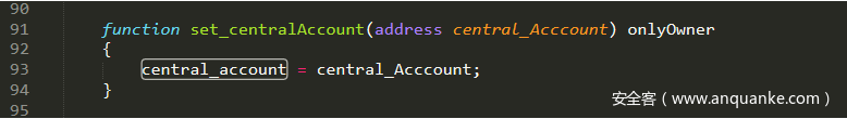 之后搜索central_account发现central_account由函数set_centralAccount进行赋值操作,此处的修饰器为onlyOwner: