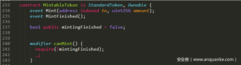 可以看到”mintingFinished”为”False”,即满足”canMint”修饰器条件,所以此时的burnFrom函数可被合约的owner调用来操控任意用户的代币。