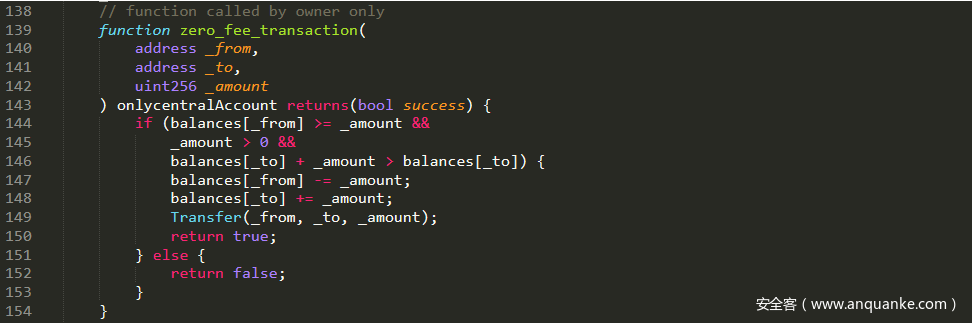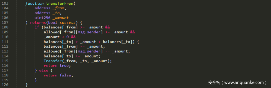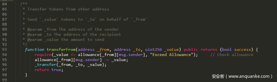 漏洞分析:在智能合约中常见的转账方式大致有2种,一种是直接转账,例如常见的Transfer函数,该函数有两个参数,一个指定代币接受的地址,另一个为转账的额度,例如: