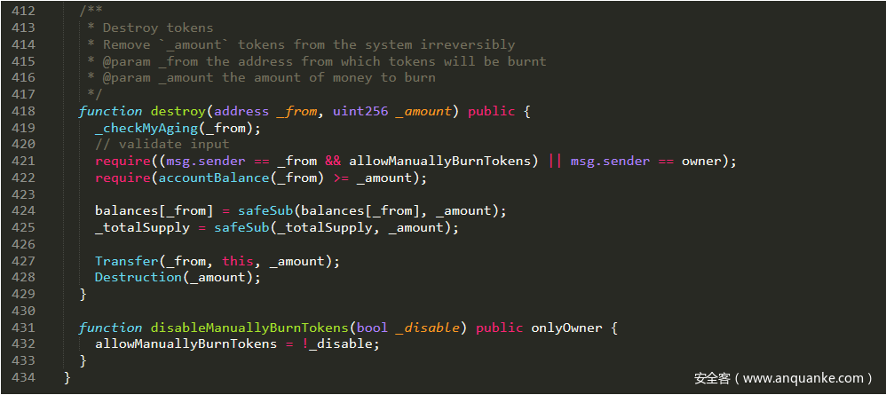如上图所示,在智能合约当中提供了destory函数,用于销毁目标账户的代币,在该函数当中增加了对msg.sender、accountBalance的判断,从整个逻辑上可以看到主要有两种销毁途径: