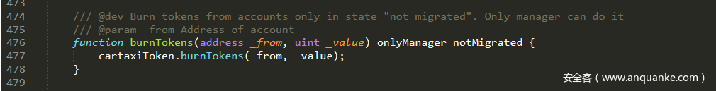 漏洞分析:如上图所示,burnTokens用于销毁用户的代币,由于销毁的地址参数、销毁的代币数量都可控,所以合约的调用者可以销毁任意用户的代币,但是该函数只能被合约的ICO地址用户调用,下面跟踪一下该账户看看其实现上是否可以