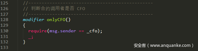 漏洞分析:如上图所示合约中的melt函数用于销毁代币的token,且该函数只能被合约的CFO调用,同时由于地址参数dst可控,故合约的CFO可以销毁任意地址用户的代币,onlyCFO修饰器代码如下所示