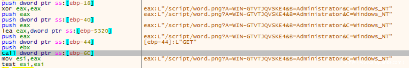 请求⽅式为GET,请求的参数为:eax:L”/script/word.png?A=WINGTVTJQVSKE4&B=Administrator&C=Windows_NT”