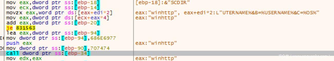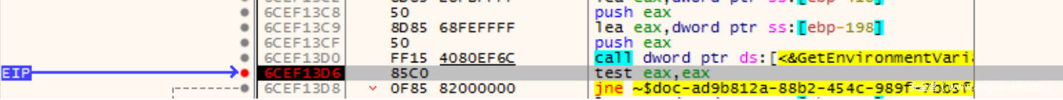 新设置eip,然后运⾏过来,此时GetEnvironmentVariableW将能够正常获取,能够跳转到下⾯的call