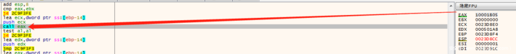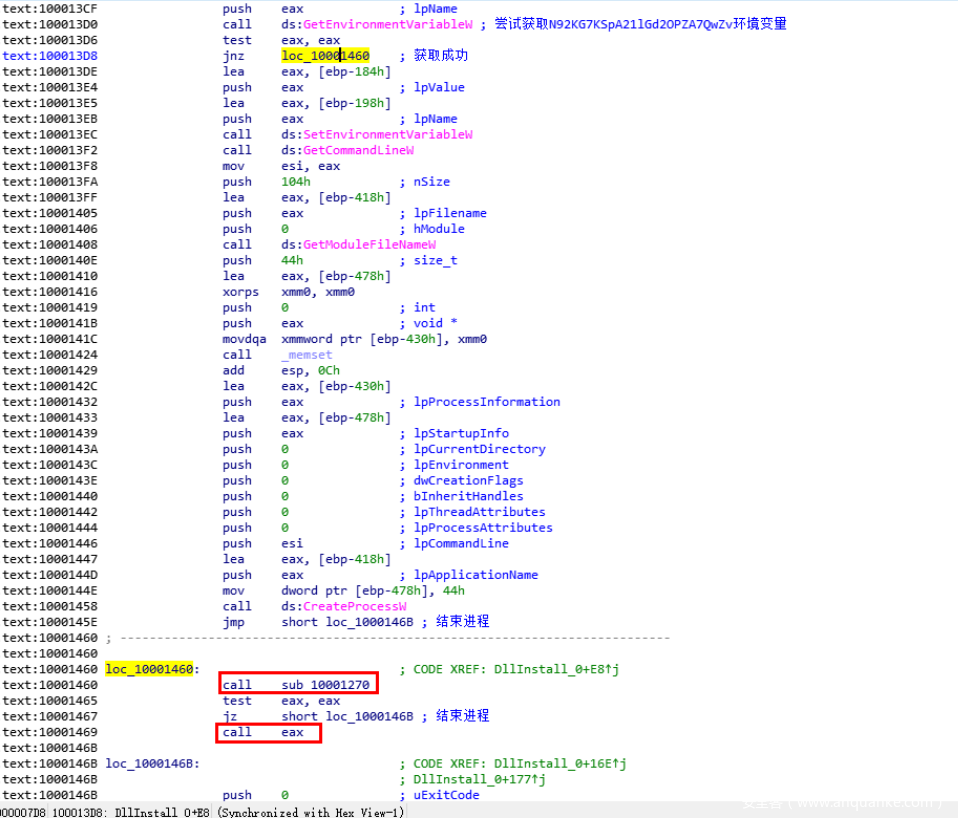 如果获取成功,则会跳转到下⾯去call sub_10001270,然后call eax进关键功能。