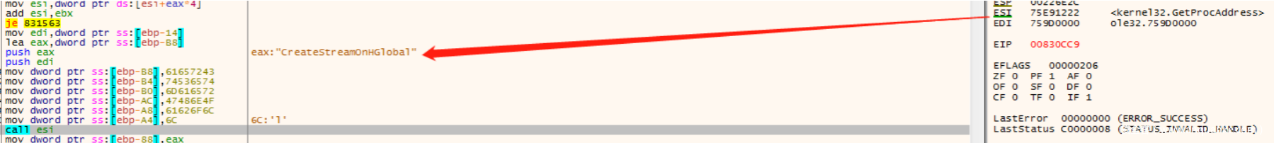 通过call esi 获取⼀些API的地址,⽐如CreateStreamOnHGlobal
