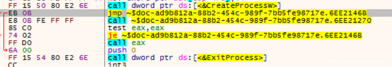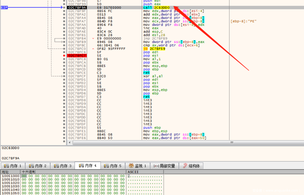 然后通过call eax的⽅式call到新的PE中