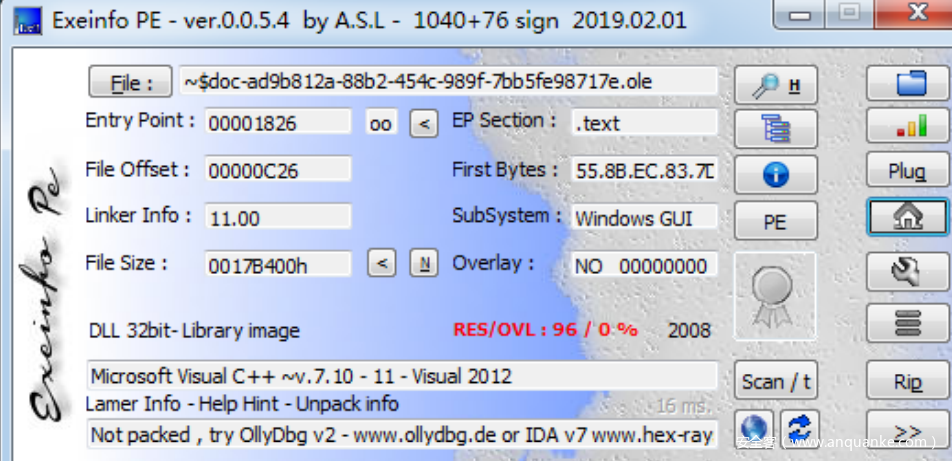 使⽤exeinfo可以看到该ole文件是vc系列编译器编译的标准dll⽂件。