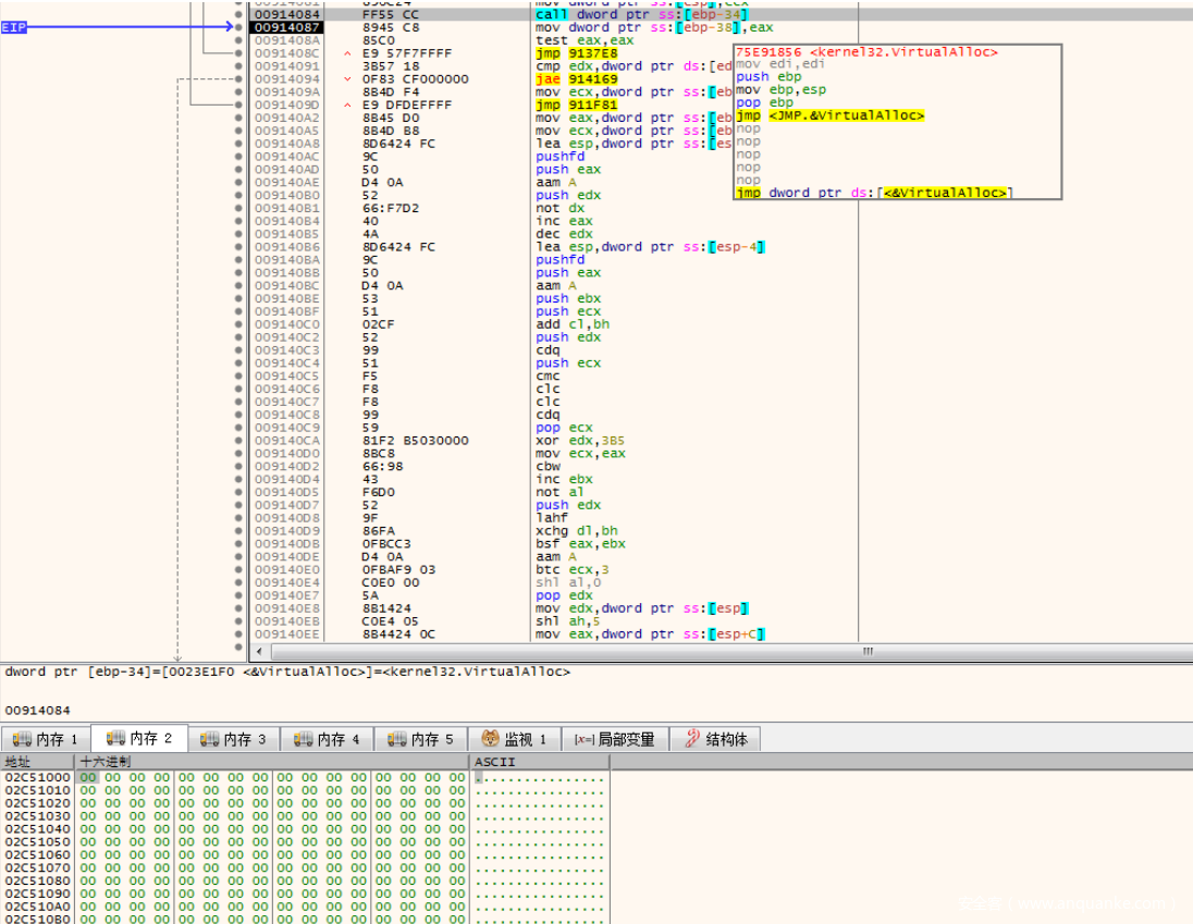 然后call eax,跳到先前分配填充的内存执⾏: