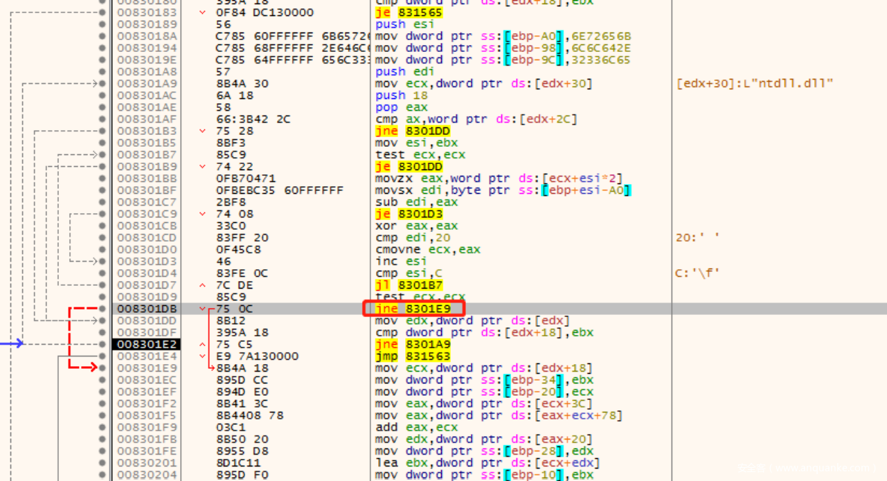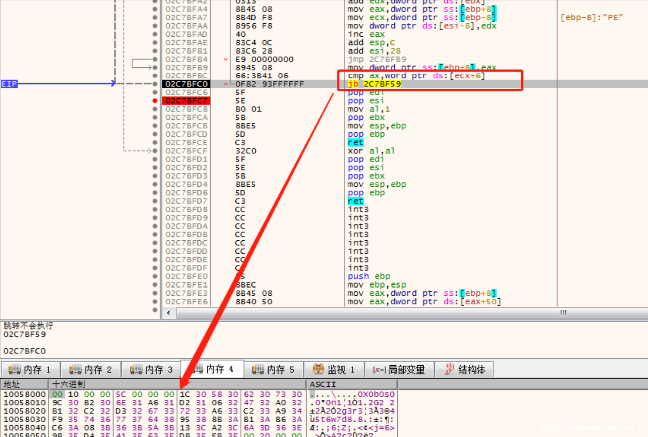 是跳转到了jmp后⾯的⼀⾏语句,所以如果要设置断点或是通过F4跑完循环,请设置在jmp语句之后。