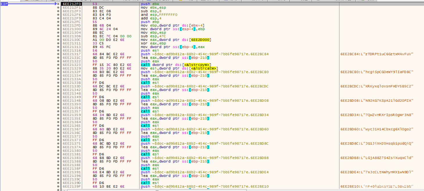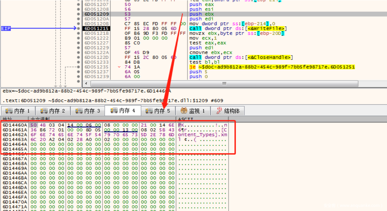 可以在WriteFile函数出看到具体写⼊内容为docx⽂档: