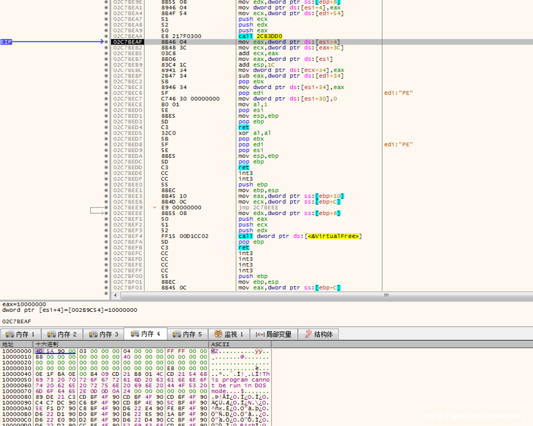 过来之后,程序通过VritualAlloc在10000000分配了⼀⽚内存