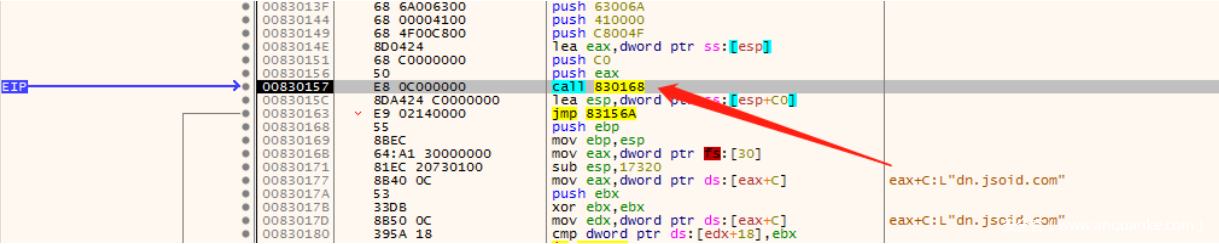 往下⾛,会解密出⼀个域名放⼊eax中,然后作为参数call 830168 完整的域名是:jcdn.jsoid.com 这⾥可