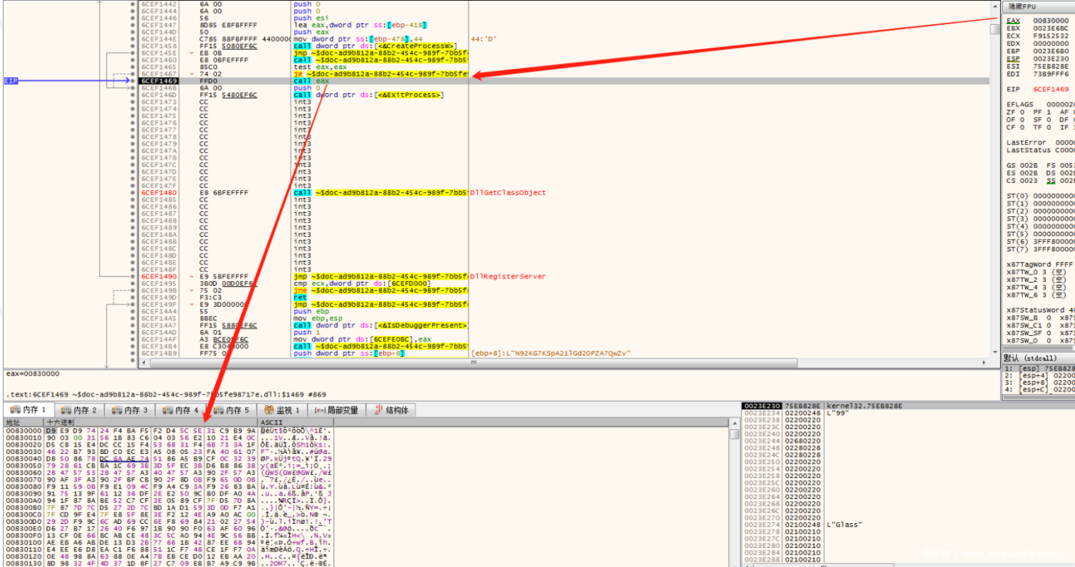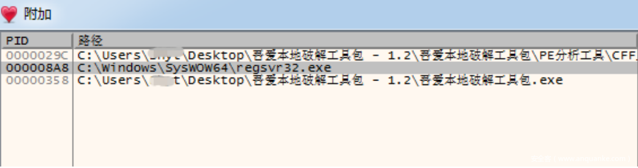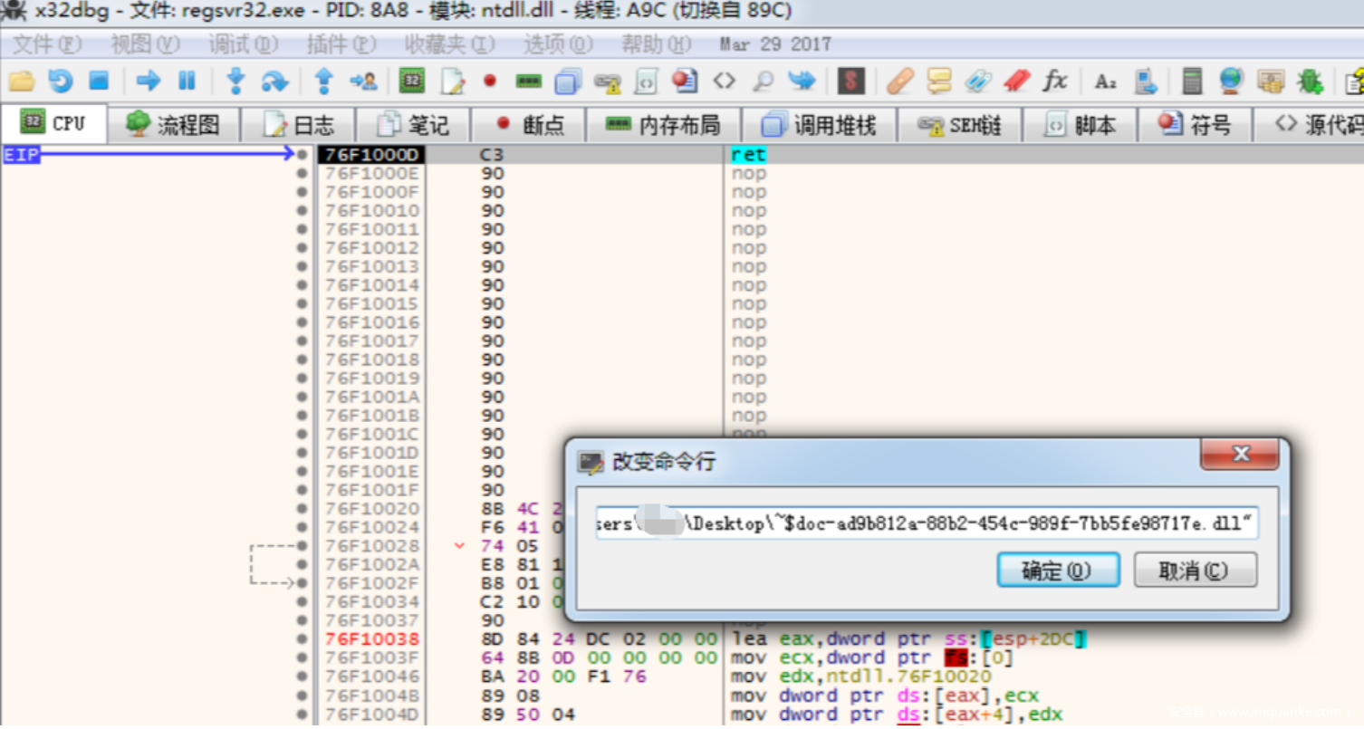 为了能够绕过这个检测正常调试,可以使⽤调试器附加regsvr32.exe