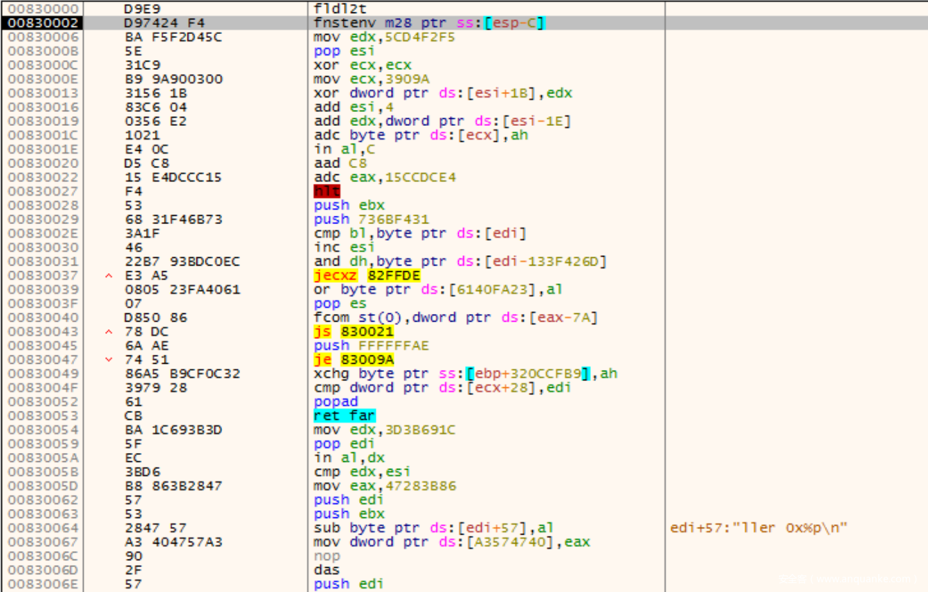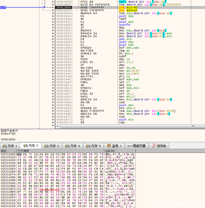 call进来之后,程序会有很多解密指令和花指令,在解密过程中,有⼀些⼩地⽅需要注意,⽐如这⾥的jne