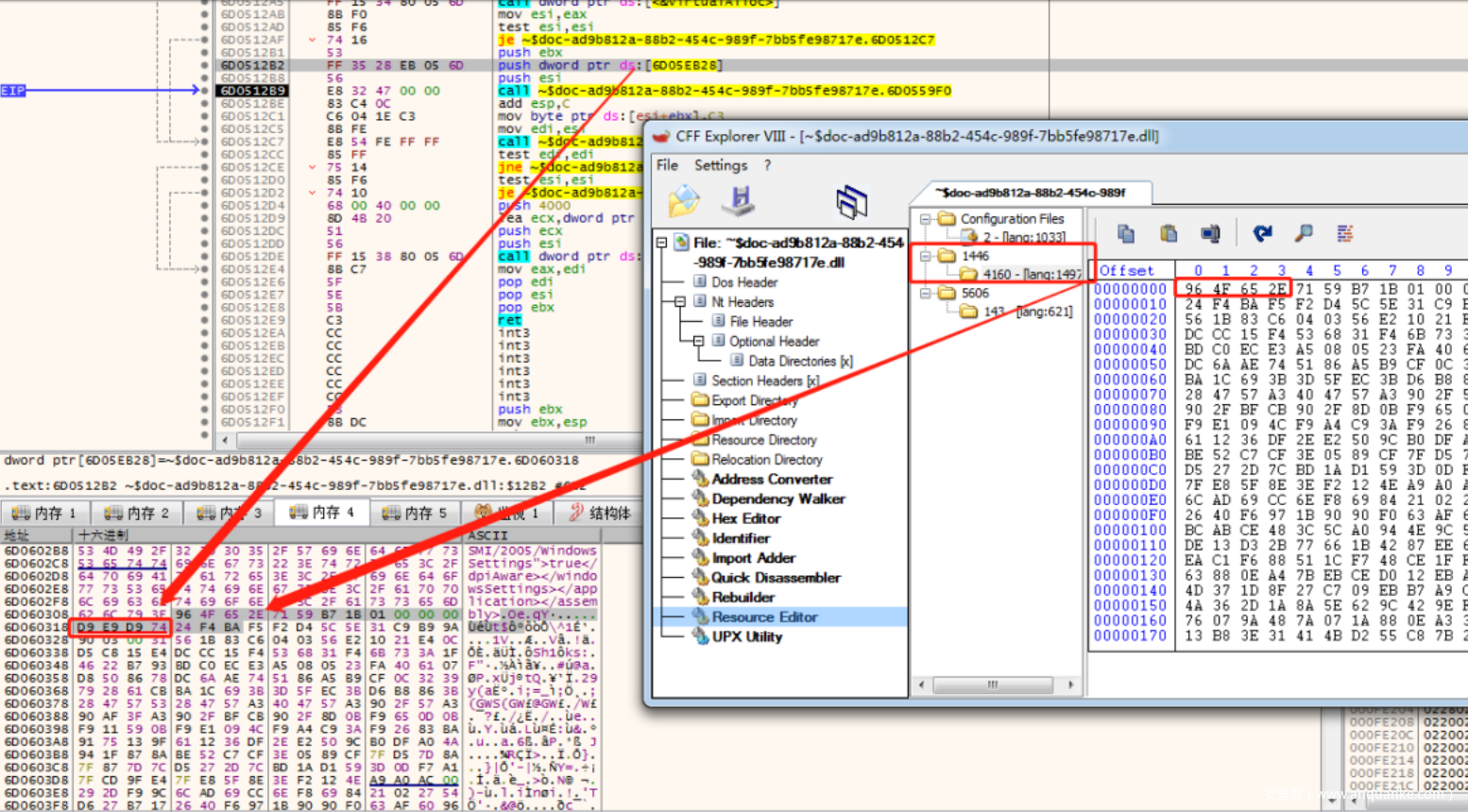 然后在12b处通过_memmove设置内存,将资源读取过来,这⾥读取的是名为1446资源的数据