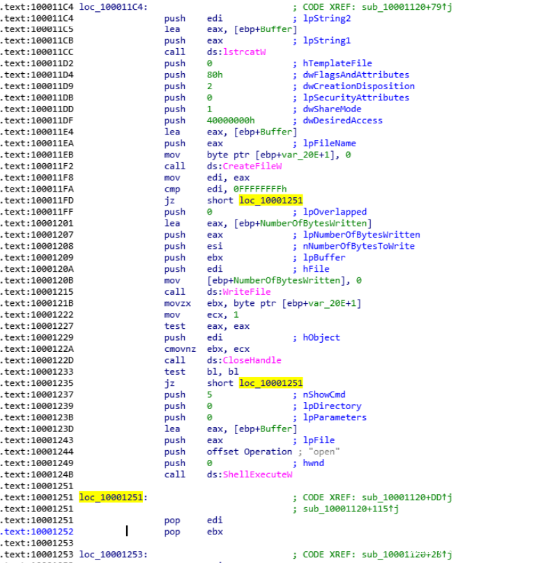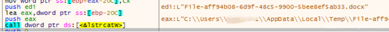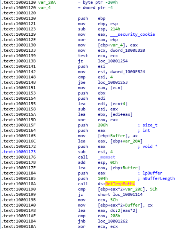 在sub_10001120中,⾸先会通过GetTempPathW获取%temp%路径