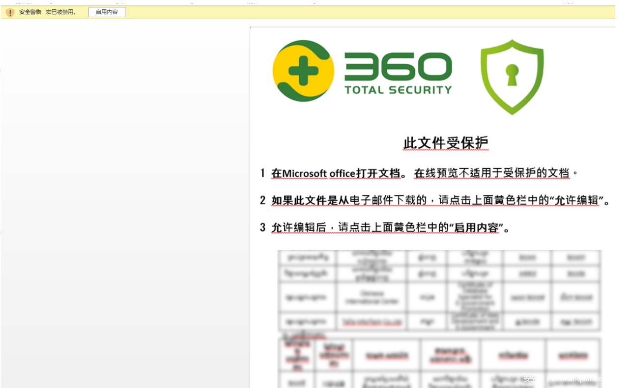杀软公司提示⽤户启⽤宏,仿冒国内安全⼚商是为了降低⽤户的警惕性,提升攻击成功率。