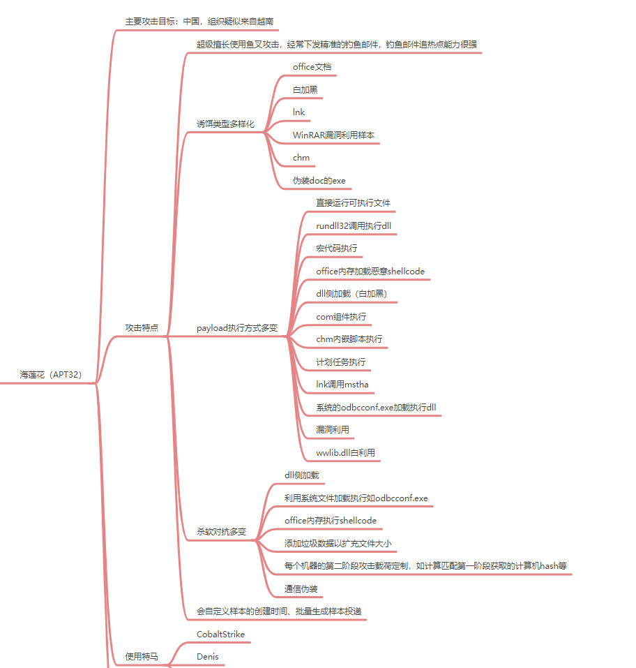 根据一些公开的情报,笔者之前做了一个关于海莲花的组织的思维导图,大概如下: