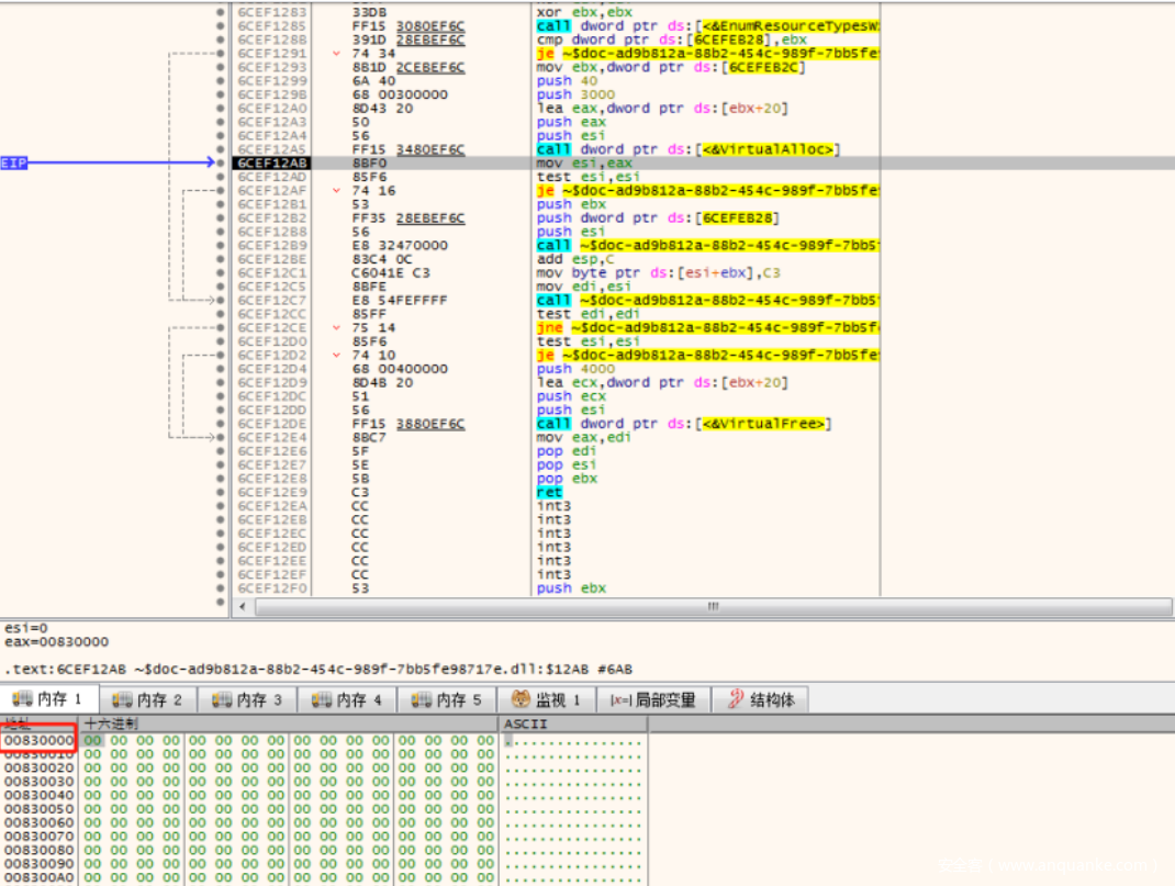 进来之后,成功VirtualAlloc分配了00830000开始的⼀⽚内存