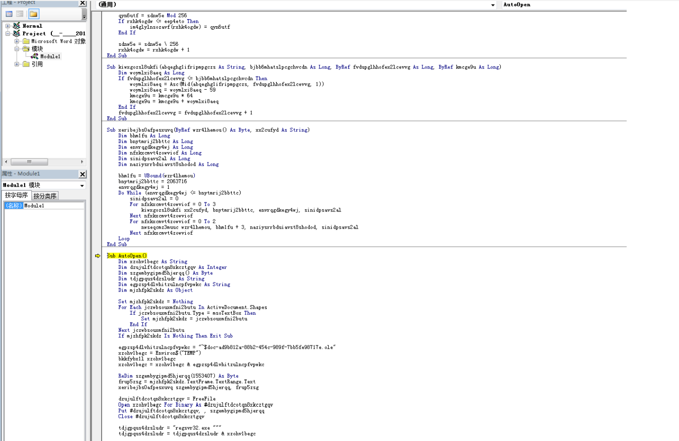 打开宏代码窗⼝,可以看到宏代码带有轻微混淆,⼊⼝点在AutoOpen():