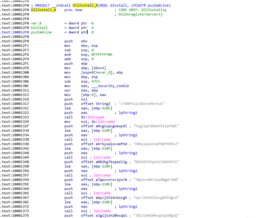 dllinstall函数⾸先是通过lstrcat函数拼接了多个特殊处理过的字符串。