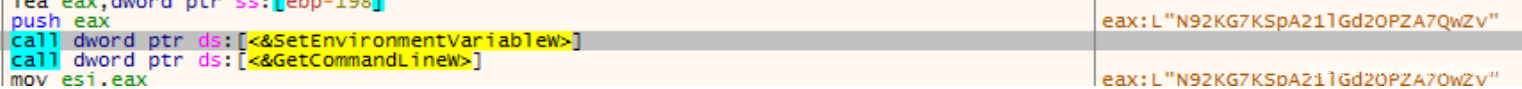 那么程序就通过SetEnvironmentVariableW设置环境变量N92KG7KSpA21lGd2OPZA7QwZv,然后在下