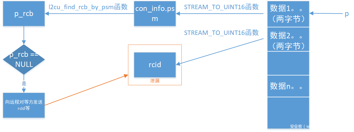 从堆栈上通过函数STREAM_TO_UINT16分别读取两字节到con_info.psm和rcid,con_info.psm再通过函数l2cu_find_rcd_by_psm函数得到p_rcb,对p_rcb进行判断,如果p_rcb == NULL(可以通过提供未注册的协议/服务多路复用器ID字段来实现),会读取rcid等信息。